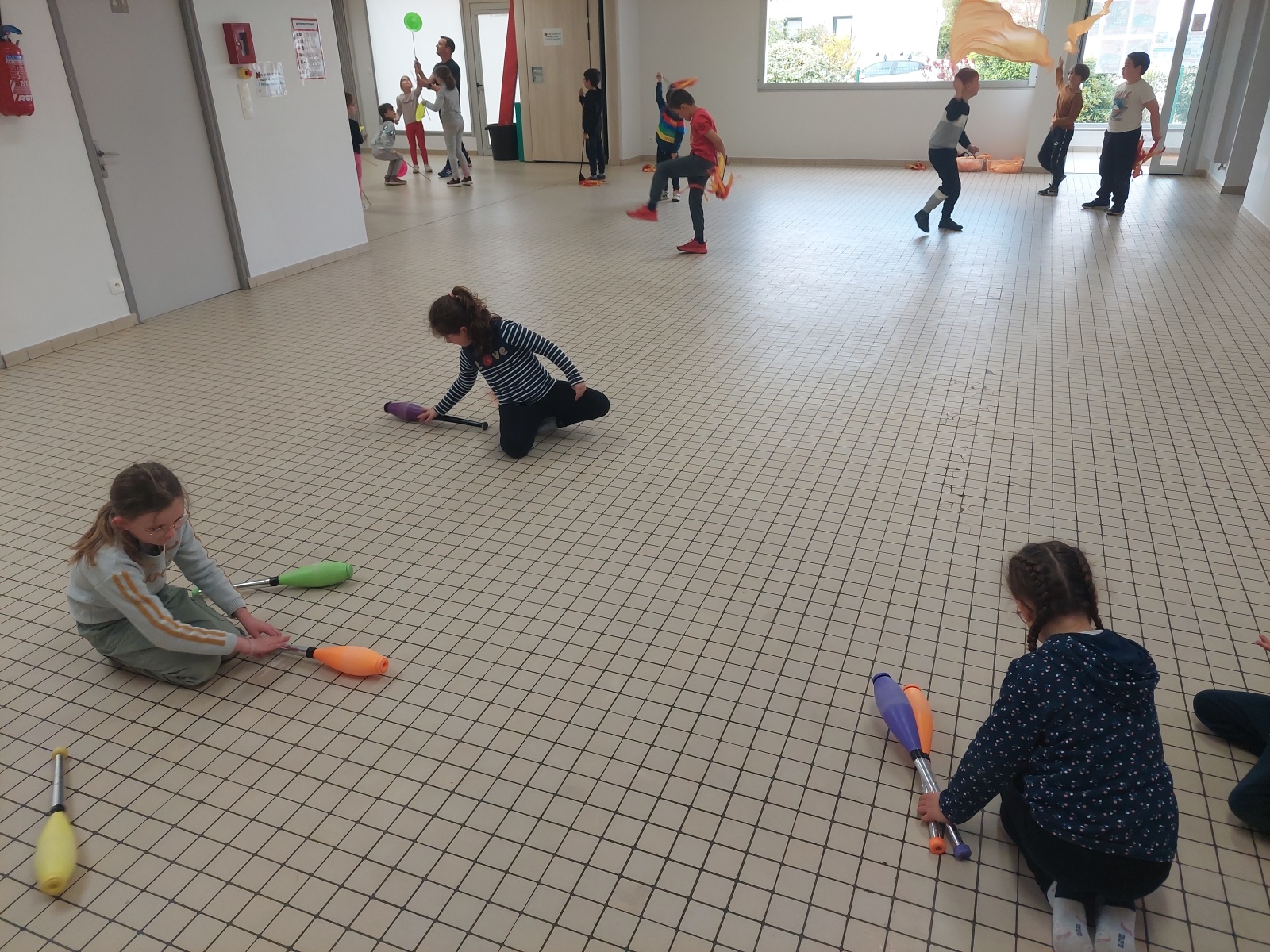 Depuis le mois de mars nous avons fait 5 séances de cirque avec Fabien de la compagnie Fabigan. Nous avons découvert qu’il y avait 5 familles dans les arts du cirque: