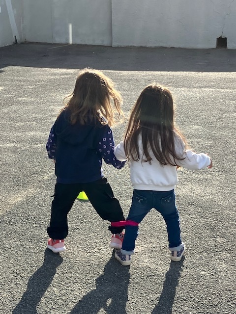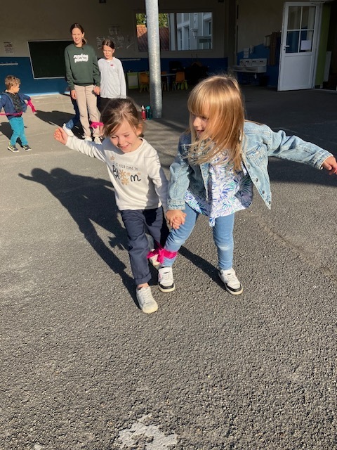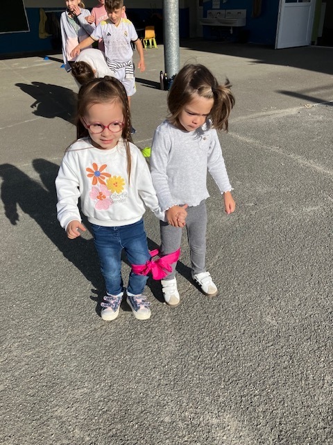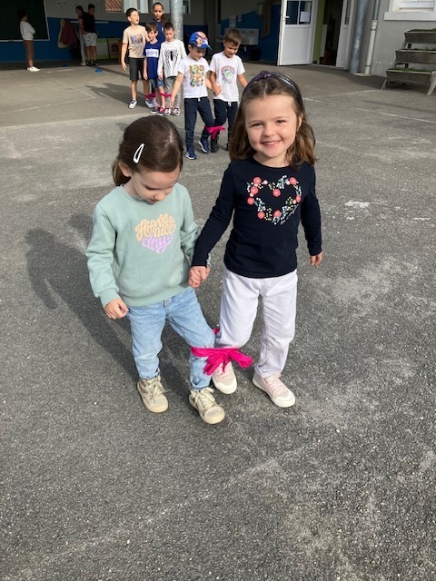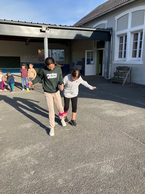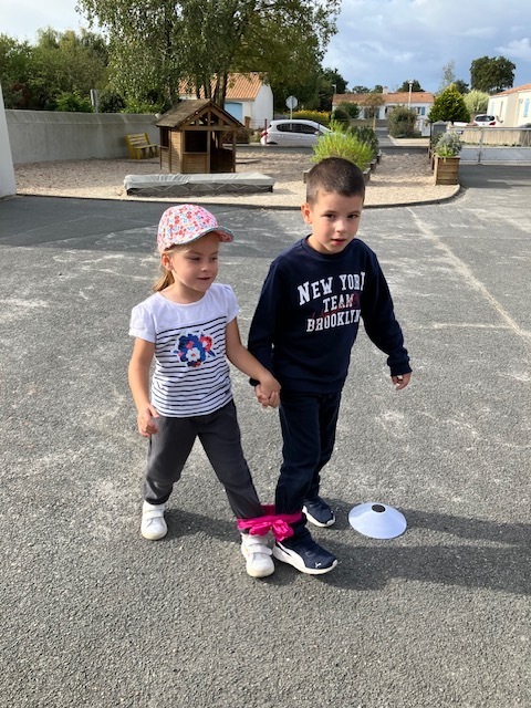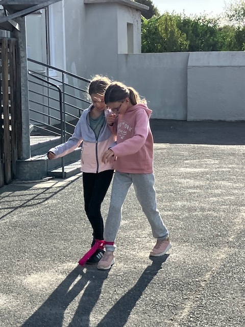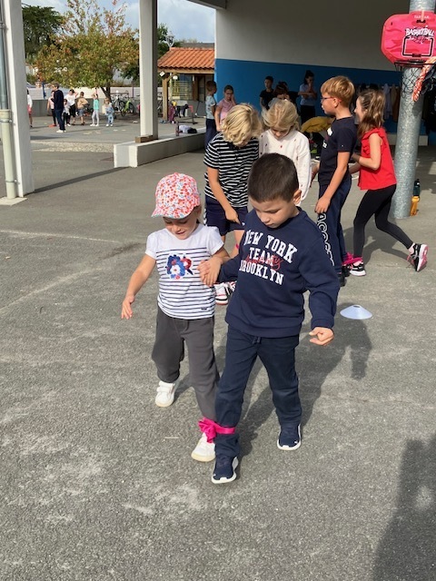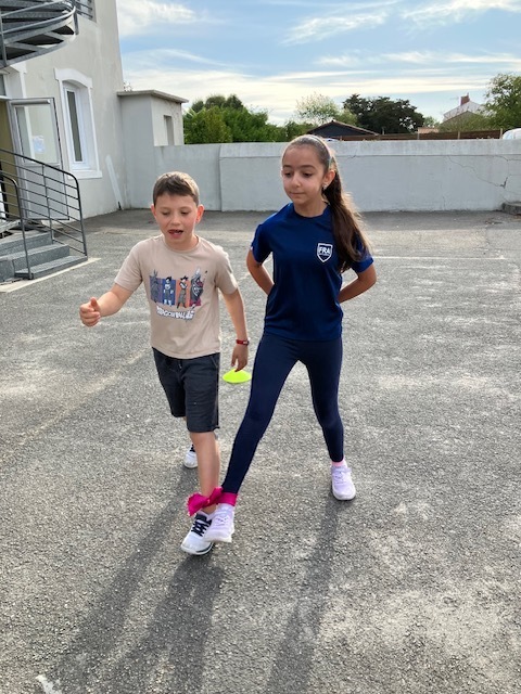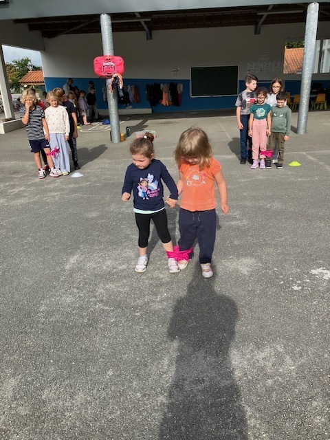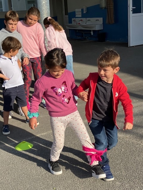 Relais jambes attachées : il fallait courir en duo avec les jambes attachées, et c’était très drôle de tomber parfois en essayant de s’équilibrer !
