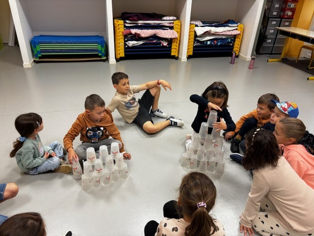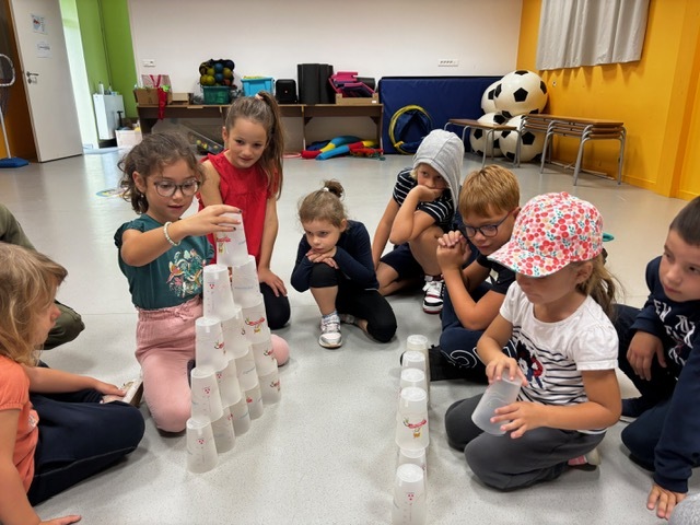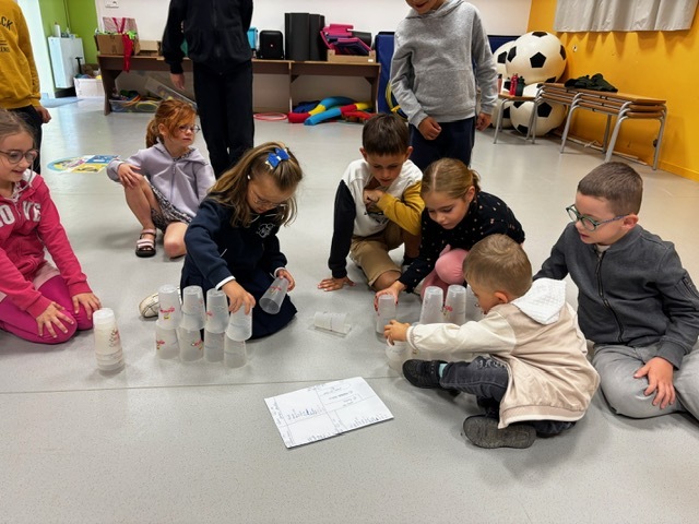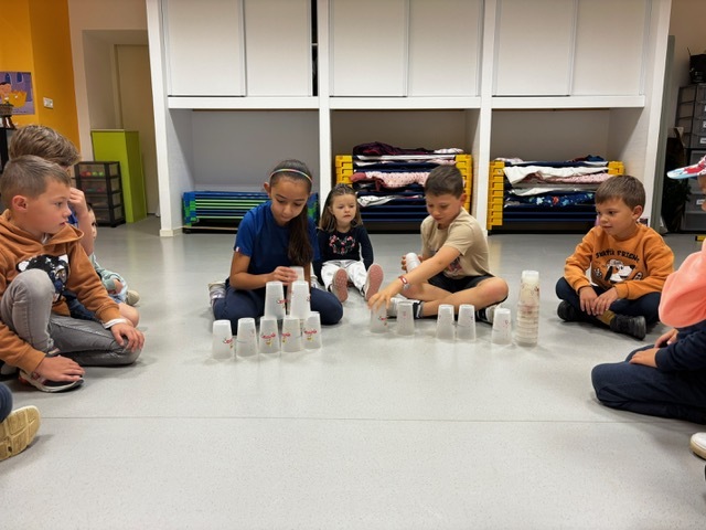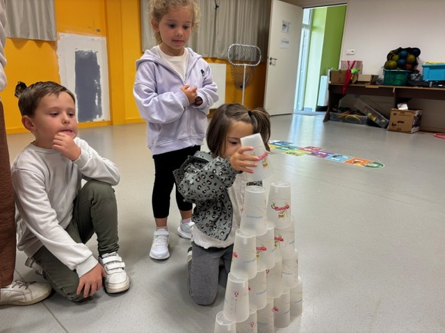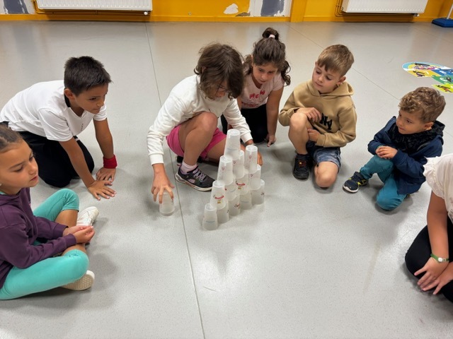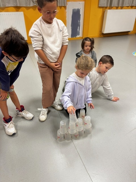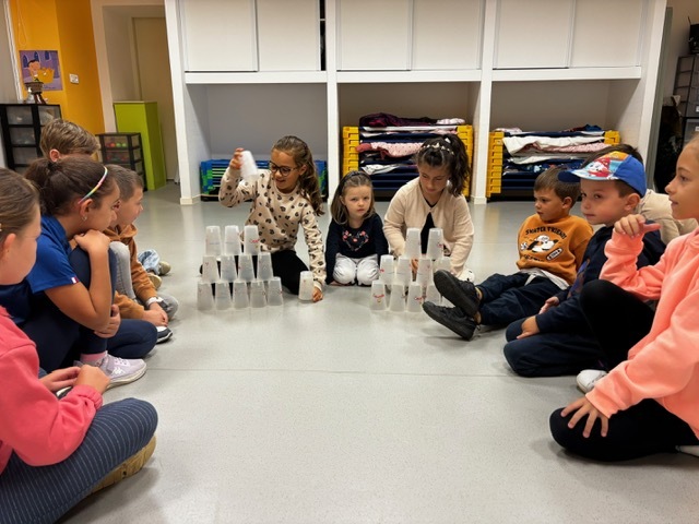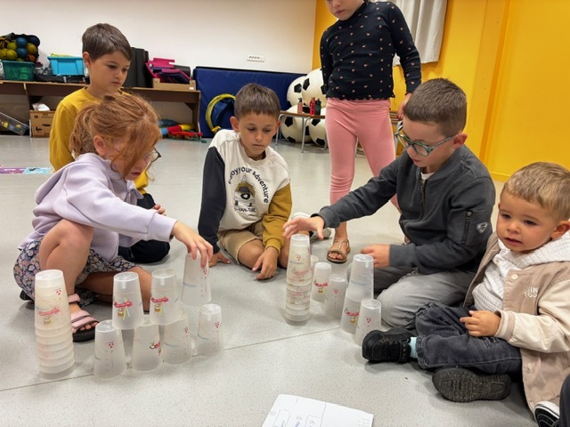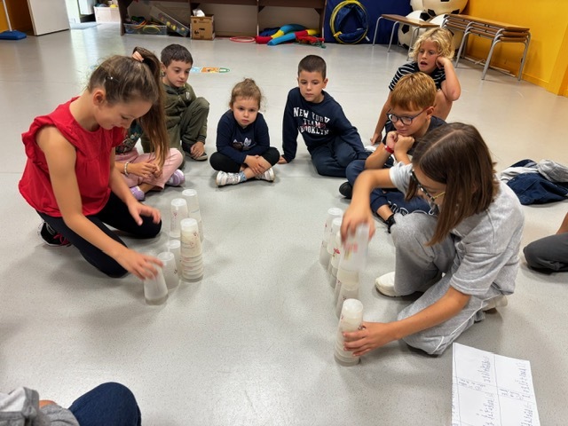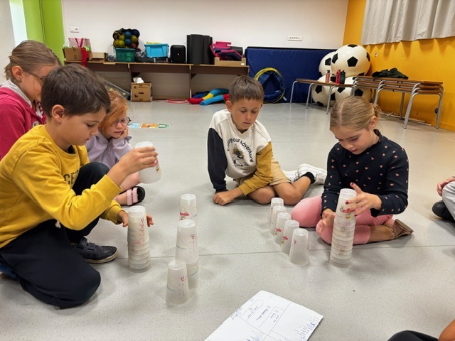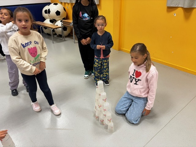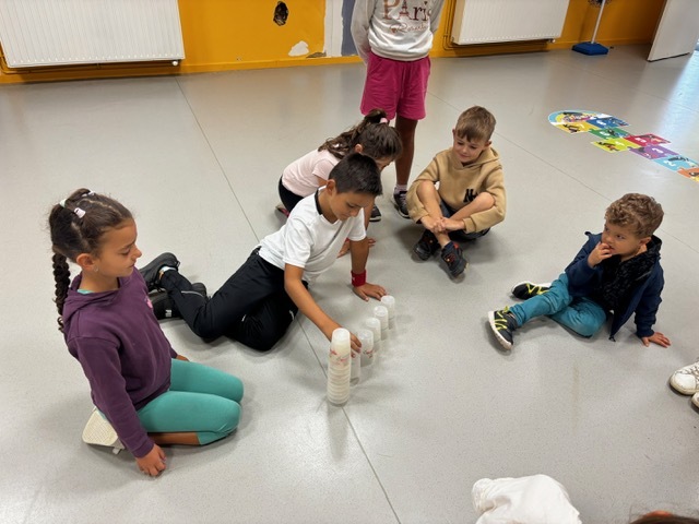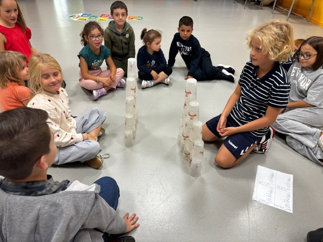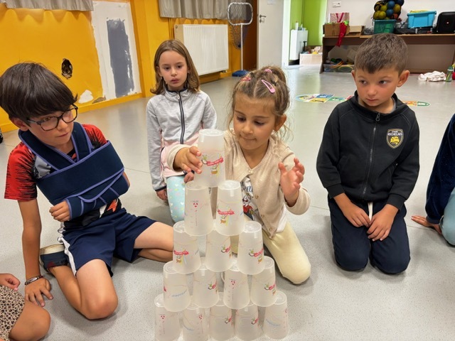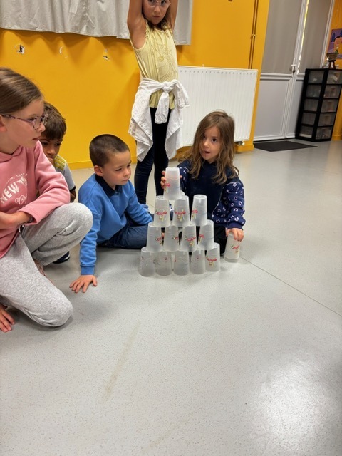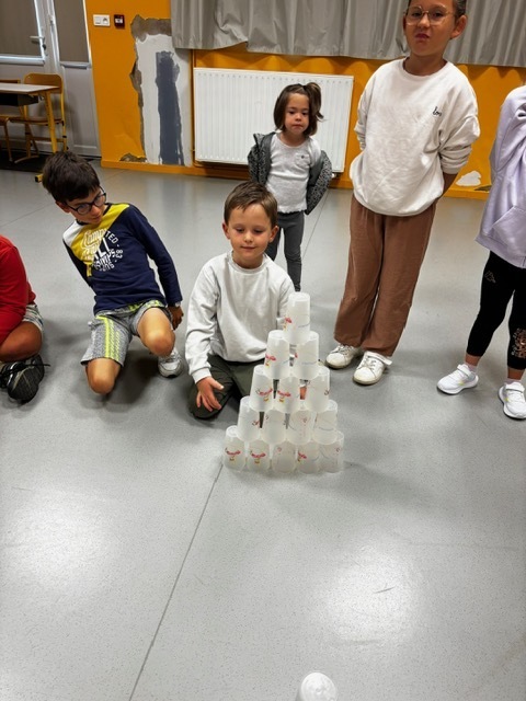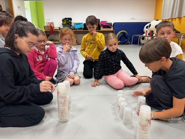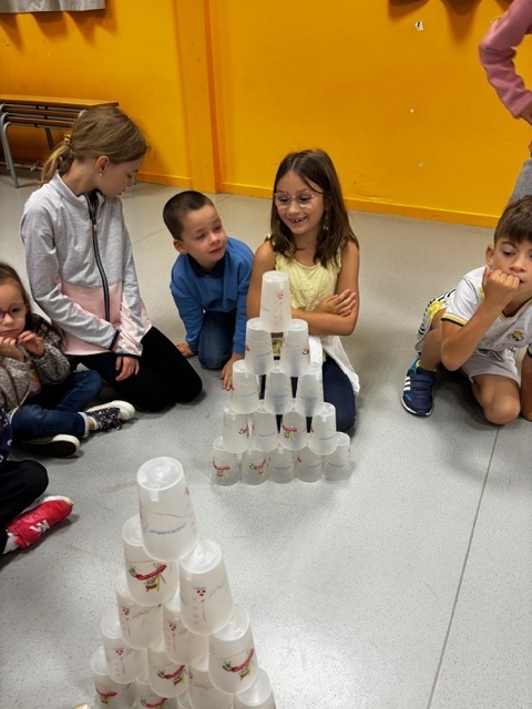 Challenge des cups (château de verres) : il fallait construire et empiler des gobelets le plus vite possible sans les faire tomber.