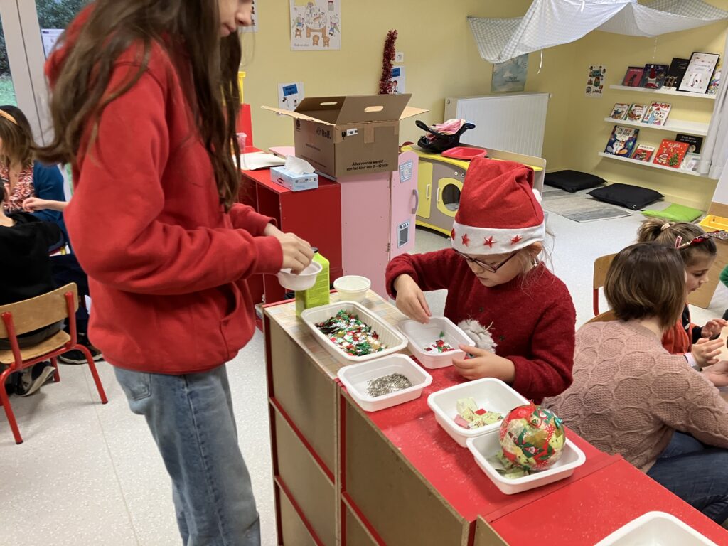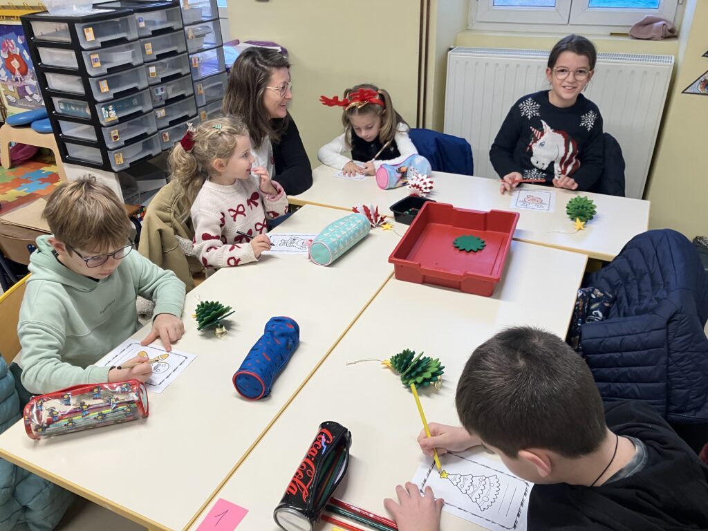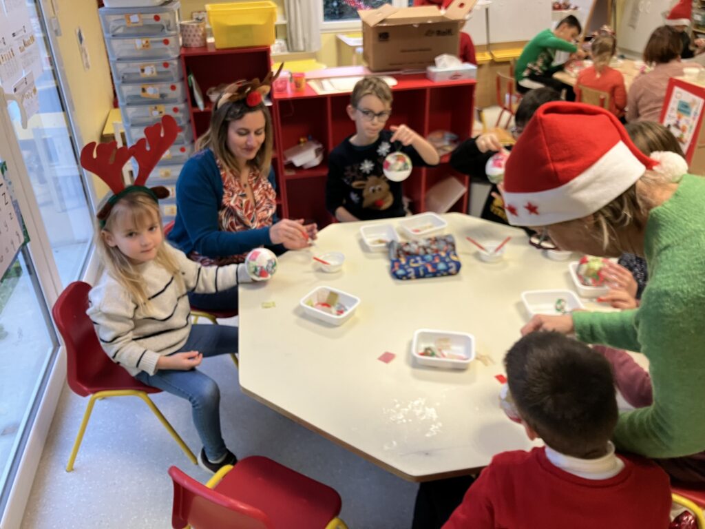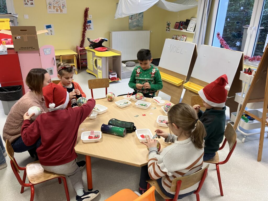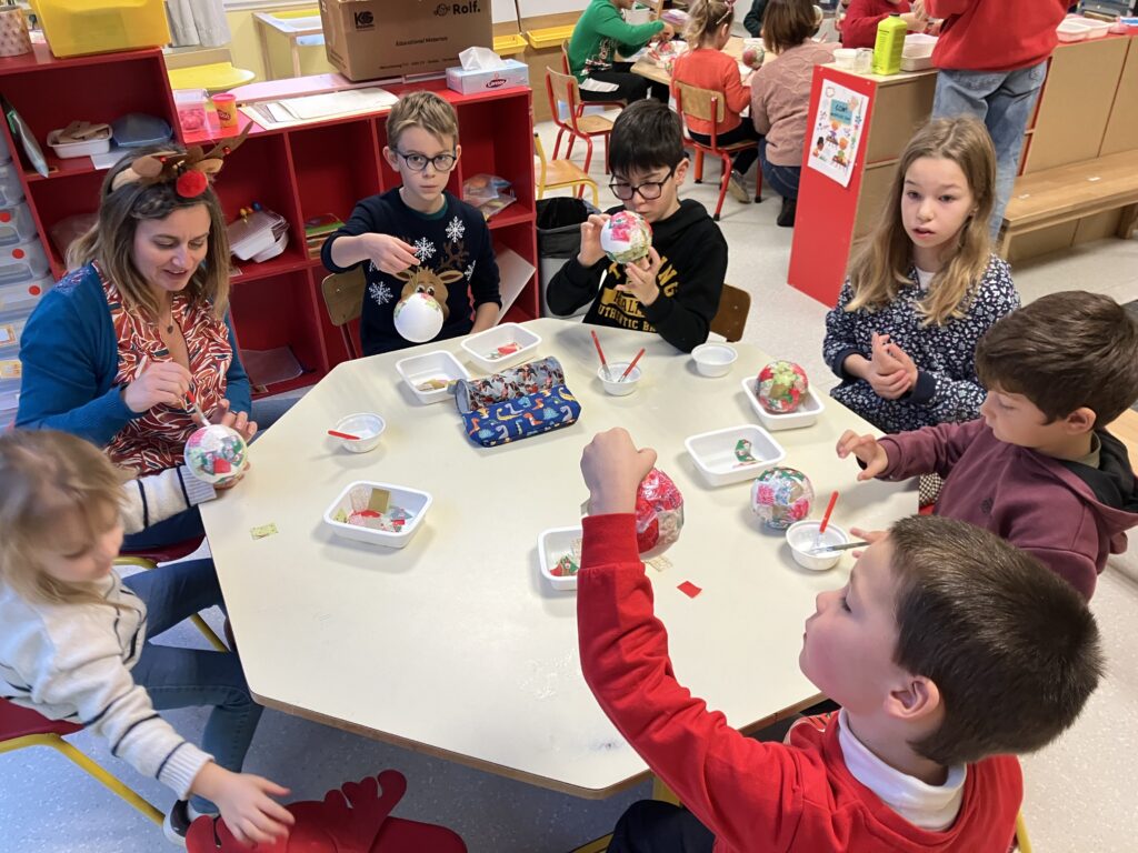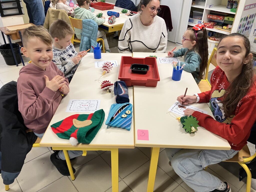 Accompagnés par des adultes, enseignants, personnels et parents bénévoles,  les élèves ont réalisé de jolies décorations de Noël, dans une ambiance joyeuse et conviviale.